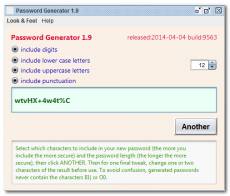 Keywords: HTTP, server, MIME, extension, configuring, check, validation Generates random passwords that are hard to guess. It uses a crytographic quality random number generator. The passwords are generated locally in a Java Applet. They are never transmitted over the Internet, even in encrypted form. It lets you choose the length of the generated password (default 12 characters) and what characters you want to include in the password. You can also run it as a standalone program, invoking it with java.exe -jar password.jar or password.jar You can also run it online at the mindprod.com website without installing it.