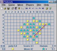 Keywords: gomoku, noughts and crosses, renju, tic-tac-toe, five in a row, piskvorky, board game, logic game This game is often called GoMoku or Five in a row. You must make five symbols in a line and do that sooner than your opponent. You can choose a skin, set time limit for a move, set time limit for whole match, save positions to disk, undo all moves. The log window shows coordinates and time of every move. Many external artificial intelligences from Russia, China, Hungary, Czech Republic and USA can be downloaded from gomocup web site. Some of them are so hard that it's almost impossible to win. Others are suitable for beginners. Network game is possible between 2 computers if at least one of them has public IP address.