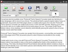 Keywords: Text to Voice Konverter, Audio Books, Text to Voice, Smart Pause, Convert any text into Speech Convert any text into audible voice. Pistonsoft Text to Speech Converter speaks any text aloud in multiple languages with a voice of your choice. The newly developed text to speech algorithm makes it simple to narrate texts, documents and HTML pages, or produce audio books from any text. Pistonsoft Text to Speech Converter can make audio books in WAV and MP3 formats, allowing you carrying your books with you no matter what kind of an audio player you use. The advanced Smart Pause feature makes voice readings sound natural by automatically pausing the speech when a human reader would catch their breath. Pistonsoft Text to Speech Converter can speak aloud Word documents, voice text files and read text from Web pages and HTML documents aloud to make Windows accessible for the sight-impaired. Make audio books of any size with Pistonsoft Text to Speech Converter! The advanced text to speech algorithm makes long narrations easy on the ear by adapting the rhythm of the narration to comply with human psychology. The advanced Smart Pause feature dramatically increases reading quality by automatically detecting situations where a pause should naturally occur, and pausing automatically where a human reader would pause reading to catch their breath. Bring some reading with you on a road trip! Pistonsoft Text to Speech Converter produces audio books in WAV and MP3 formats, allowing you to bring your favorite books on a long-haul flight or a road trip. The advanced text-to-voice engine can handle text documents and audio files of any size, and supports Microsoft Word (. DOC) documents, Web pages (. HTML) and plain text (. TXT) files. Select the voice, speed and volume to make audio books that sound best to your ears. Pistonsoft Text to Speech Converter supports all SAPI 5 voices installed on your computer, and supports additional voices that can be downloaded from partner's web site.