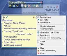 Keywords: desktop notes, desktop reminder, notes, reminder, organizer, stick, notes manager, organizers, sticker, sticky notes The program Power Notes is a desktop notes organizer, reminder and scheduler for Windows allowing you to create electronic stickers and display them when the time is due. The program is very easy to use and has low system requirements. The scheduler stays in the tray and does not interfere with your activities. If necessary, it can be displayed as a small toolbar on the desktop. All the parameters you may need to change are customizable: a sticker can be of any size, it can have any color scheme (which can be useful, for example, to tell between stickers on different topics) and you can use various skins for stickers. We also implemented sound schemes to accompany the display of stickers. Together with the wizard for creating stickers, it is possible to edit them either quickly or in the advanced mode. The program allows you to specify the date any time of a reminder in every detail with the help of 'Alarm Wizard' (it is possible to set the start and stop time of displaying, set it at certain time intervals, on certain dates, etc.). Along with actually displaying stickers, the scheduler can launch programs and files, open pages in your web browser. The program also supports a multilingual interface. Power Notes will never let you forget anything!
