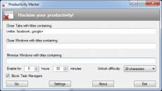Keywords: productivity master, block facebook, block twitter, block reddit, productivity software, increase productivity, productivity, no distractions Productivity Master helps you focus on your work by disabling what constantly distracts you. Need to block Facebook or Twitter? Just tell Productivity Master to close them. Checking your email constantly? Disable the corresponding websites or applications for a while. Must prevent a certain game from running so you can focus on your essay? Productivity Master is here for the rescue. You specify which browser tabs to disable, which applications to close or minimize. Set the amount of time you want them to be disabled, set an unlock difficulty and click 'Go'. That's it, you just increased your productivity. After you activated Productivity Master you can still add more applications and websites to the block list or extend the amount of time the block is in effect. If you need to remove the block before the time runs out, you can unlock the application by entering a randomly generated character string that depends on the difficulty you selected (5 - 100 characters).