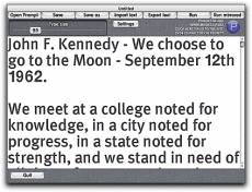 Keywords: teleprompter, AUTOCUE, text, scroller, video, teletext Prompt is an affordable simple teleprompter software solution for Mac and Windows. User configurable, Prompt! can save in it's own format and .txt to share between users on Mac and Windows. Features: Plain text can be imported and exported. - Simple text edit including copy, cut and paste. - Control over font size and font choice. - User control of scroll speed and smoothness using the mouse or keyboard or remote (not supplied). - Looping function for unattended use in the keyboard run mode with single display. - Prompt saves in it’s own file format (.pmt). So you can send a Prompt file to the person who will be reading and they can send it back to you with their own TABS set, masking placement and any changes to the text including the font size. - You can click and drag the Prompt window to reposition by clicking on the titlebar or the gray area in the edit area or the filename in the scrolling area. - Option to hide the desktop with black. - Macintosh or Windows playback with interchangeable saved .pmt files. - Multi-language support (Left to Right languages only). - Horizontal flipping (mirroring) of text alone or running flipped/unflipped on multiple monitors or both unflipped on multiple monitors for those who use hardware flipping on one display. - On-screen timer/progress indicator including estimated time to end of scroll. - Cue points (Tabs).