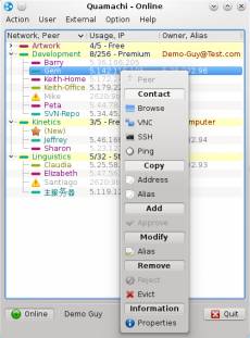 Keywords: network, networking, sharing, p2p, hamachi, logmein -------------------------------------------------------------------------------------------------------------- Quamachi is a Hamachi GUI for Linux. Hamachi is a zero-configuration VPN service. It was designed by LogMeIn. Use Quamachi if you want to: * Access VPNs via a mature GUI * Browse remote Samba file-shares * Remotely control via SSH and VNC * Flexibly choose optional dependencies --------------------------------------------------------------------------------------------------------------