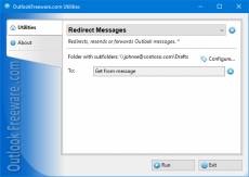 Keywords: free, freeware, outlook, add-in, add-on, send, messages This free utility allows you to forward, redirect, or resend Outlook email messages with additional features. Just specify the folders with the original messages to be forwarded or select them, select the desired account, sender, recipients, edit subject and text of the forwarded messages, and run the utility. During execution, the utility will send a new message based on each source message, changing all the specified fields. In addition, the utility can delete the original message, if necessary. Unlike the standard Outlook forwarder, the utility will not quote the original message by adding a header. If you need to, you can create a header by using text and macros. The unique feature of the utility is the ability to use HTML tags in message texts. Key advantages of the utility: - Forwards, redirects, or resends Outlook emails with one click. - Allows you to change email account, sender, and recipients (including "To", "Cc" and "Bcc"). - Allows you to change the subject of the message and the text of the message, replacing the text completely or inserting a fragment at the beginning or end of text. - Seamlessly integrates into Outlook rules, enabling you to forward incoming messages automatically with advanced settings. - Supports HTML formatting of message texts. - Expands macros in message subjects and texts using the data of the original message. - Provides a command line utility for automating in various scenarios and running on a schedule. Support for integration with Outlook rules and command line opens up additional possibilities for automating forwarding and redirection, using in batch files, scripts, running by schedule in Windows Task Scheduler, and other scenarios.