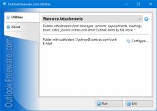 Keywords: free, freeware, outlook, add-in, add-on, attachments, delete, messages, contacts, calendars, journals, tasks This free tool automatically deletes and removes Outlook attachments from messages, contacts, calendars, meetings, tasks, notes, journal entries and other Outlook items by file mask. Key utility benefits: - Removes attachments from any Outlook items in all selected folders, including subfolders. - Deletes embedded (attached) messages, contacts, appointments and meetings, tasks, notes and other Outlook items. - Can remove hidden attachments. - Provides filtering by item types, names, extensions and sizes of attachments, and by message dates. Works with Outlook search folders, allowing you to filter messages even more flexibly. - Able to run directly from Outlook, removing attachments from the selected messages at once. - Integrates with Outlook rules, automatically removing attachments from incoming messages. - Contains a separate application for deleting attachments without having to start Outlook. - Allows the application to remove attachments from the command line. When intensively working with email, messages with attachments accumulate in the "Sent Items" and other Outlook folders. In addition, appointments and meetings, contacts, tasks and other Outlook items can also contain various attachments. To delete unnecessary attachment files, select the Outlook folders, specify the required settings, and start the removal process. Here, you can delete attachments of any types from any Outlook items; even blocked and hidden attachments. Using the command line in your batch files and scripts allows you to remove attachments from PST files, different Outlook and Exchange Server mailboxes, and delete attachments by schedule.