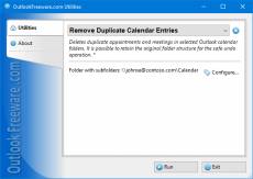 Keywords: free, freeware, outlook, add-in, add-on, duplicates, delete, calendars Free and easy way to move, remove or delete duplicate calendar items (appointments and meetings) in Outlook calendar folders. The whole operation is completely safe, because you can always reverse the removal action. Advanced version allows you to select fields to compare, finds duplicates across different folders and storages and supports the priority of Outlook folders. For your convenience Outlook add-in allowing to run the tool right from Outlook and standalone launcher application allowing to run the tool without the need to run Outlook are included in the product.