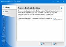 Keywords: free, freeware, outlook, add-in, add-on, duplicates, delete, contacts Free and easy way to move, remove or delete duplicate contacts in Outlook folders. The whole operation is completely safe, because you can always reverse the removal action. Advanced version allows you to select fields to compare, finds duplicates across different folders and storages and supports the priority of Outlook folders. For your convenience Outlook add-in allowing to run the tool right from Outlook and standalone launcher application allowing to run the tool without the need to run Outlook are included in the product.