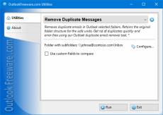 Keywords: free, freeware, outlook, add-in, add-on, duplicates, delete, messages Free and easy way to move, remove or delete duplicate messages in Outlook folders. The whole operation is completely safe, because you can always reverse the removal action. Advanced version allows you to select fields to compare, finds duplicates across different folders and storages and supports the priority of Outlook folders. For your convenience Outlook add-in allowing to run the tool right from Outlook and standalone launcher application allowing to run the tool without the need to run Outlook are included in the product.