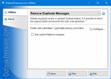 Keywords: free, freeware, outlook, add-in, add-on, duplicates, delete, messages Free and easy way to move, remove or delete duplicate messages in Outlook folders. The whole operation is completely safe, because you can always reverse the removal action. Advanced version allows you to select fields to compare, finds duplicates across different folders and storages and supports the priority of Outlook folders. For your convenience Outlook add-in allowing to run the tool right from Outlook and standalone launcher application allowing to run the tool without the need to run Outlook are included in the product.