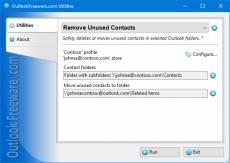 Keywords: free, freeware, outlook, add-in, add-on, contacts, delete Maintaining a contact base is one of the most popular features of Microsoft Outlook. Over time, the number of contacts grows; many become obsolete and are not used in email correspondence. Removing or moving unneeded contacts to the archive will free up space in your mailbox, speed up and simplify the search, and make work with contacts more productive. Finding unused contacts manually is a complex and time-consuming task. Our utility will do it for you - quickly, easily, and safely. The main utility benefits: - Looks for unused contacts from multiple Outlook folders at once. - Searches for contacts in email messages, calendars, tasks, and other Outlook items for a specific period. - Safely moves unused contacts to the specified folder, allowing you to restore them later. - Can search for contact email addresses among recipients and senders and in the text of Outlook items. - Works with any Outlook mailboxes, PST data files, and Exchange Server shared and public folders. - Provides a convenient launcher application, Outlook add-in, and a command line to run from your scripts and the Windows Task Scheduler. The free utility will search for contacts whose email addresses are not used in messages or other items in the selected Outlook folders. You can also search for addresses in senders, recipients, and body texts for a specified date period. Contacts with unused email addresses will be moved to the specified folder. This is safe because you can restore deleted contacts to their original folders at any time. Contacts in Outlook will become more usable and easier to work with. We provide utilities for any needs. If you do not want to delete unused contacts, you can view their list, mark them with a flag, or assign them the categories you want by using our utilities.