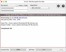 Keywords: file encryption, encryptor, encrypter, encryption, encrypt, encrypted, ciphering, encipher, crypt, encode, encoder, private, secret, confidential, secure, file, files, folder, folders, directory, directories, aes, blowfish, twofish, threefish, serpent, 256, 448, 512, 1024, bit Securely encrypt your private and confidential files or whole folders. The encryption/decryption process is simply done by dragging the selected file(s) or folders(s) to the application window. Files are encrypted using strong encryption algorithms: AES (Rijndael) 256bit, RC6 256bit, Serpent 256bit, Blowfish 448bit, Twofish 256bit, GOST 256bit + (Threefish 1024bit and SHACAL-2 512bit for Pro Version) ciphers are available. Cross-Platform (Windows, Linux, Mac OS X, ...) GUI Version and Command Line Version are available on: https://www.paranoiaworks.mobi/download Compatible with Secret Space Encryptor for Android: https://paranoiaworks.mobi/sse