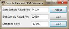 Keywords: sample, rate, bpm, calculate, calculator, semitone, semitones, pitch, shift This program is lets you calculate the BPM or sample rate required to change the pitch of audio up or down by a number of semitones. It also calculates the BPM or sample rate change required to change the pitch of audio by a specific number of semitones. It's simple, but useful if you perform any tasks that require sample rate or BPM conversion. To calculate the semitone shift from one sample rate or BPM to another, fill in the first two blanks and then click "Calc" next to the Semitone Shift text box. To calculate the sample rate or BPM change to alter audio by a specific number of semitones, fill in the first blank, enter the semitone shift, and then click "Calc" next to the "End Sample Rate/BPM" text box.