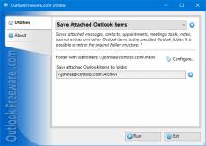 Keywords: free, freeware, outlook, add-in, add-on, attachments, save, messages, contacts, calendars, journals, tasks This free utility automatically saves attached Outlook messages, contacts, tasks, notes, calendar items, and history, and other Outlook items from different folders to the specified folder. When saving new items, it creates the same folder structure as the original messages. If attached Outlook items have other attached items, you can also save them separately. Key benefits of the utility: - Extracts attached messages, contacts, appointments, meetings, tasks, notes, and other Outlook items. - Saves embedded elements recursively (embedded items in embedded Outlook items). - When saving, creates the original folder structure. - Supports filtering by the types and dates of Outlook items. - Can mark the saved items as unread. - Add-in for Outlook gives you the ability to save items from opened or selected messages and other items right in Outlook. - Provides the additional command-line application to batch save embedded Outlook items from PST data files or Exchange mailboxes of other users. To save attachments from repeatedly attached items in Outlook first, save these items using this tool to a folder, then save the attachments from that folder using another tool we provide.