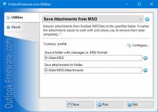 Keywords: free, freeware, outlook, add-in, add-on, msg, attachments, save This free utility extracts attachments from MSG files in the specified folder. In addition, you can process all the subfolders and create the same folder structure for attachment files in the specified location on your disk or network share. Provides a flexible set of filters, such as the Outlook item types, the extensions and names of attachments to include and exclude, dates of messages, tasks, and calendar items. You can also save embedded Outlook items, hidden attachments, and inline attachments (such as pictures in message text). To reduce the size of the MSG backup archive significantly, you can save attachments and delete them, using the other utility we provide. Key benefits of our program: - Exports attachments from MSG files, while maintaining the folder structure. - Allows you to specify the required Outlook item types in MSG files. - You can save attachments by mask, specifying only required file extensions or part of the file name you want. - Supports filtering by date range. - Can save embedded Outlook items, inline and hidden attachments. - Securely saves attachments, renaming or skipping existing ones if necessary. - Provides a separate launcher application, Outlook add-in, and a command line. Command line support allows you to automate the extraction of attachments from MSG files. You can use the command line in your batches and run the utility by schedule using Windows Task Scheduler.