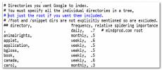 Keywords: sitemap, Google, catalog, spidering, website, directory You use a sitemap to encourage Google or other search engines to more frequently and efficiently index your website. For overview information about Google sitemaps see: mindprod.com/jgloss/google.html#SITEMAPS For overview information about this utility see: mindprod.com/jgloss/google.html#SITEMAPUTILITY. You use this sitemap utility because it is so quick you can use it before every upload so that your sitemap is always 100% up-to-date, always ready for whenever opportunity knocks, in the form of the Google spider. This approach in orders of magnitude quicker than actually spidering the site yourself with a tool like Xenu or GSiteCrawler. With the sitemap utility, you can prepare a fresh sitemap in a couple of seconds. To speed spidering, and ensure the most important files get spidered frequently, Google has created a system where you leave a compressed catalog of all your files on the website for it to find. The program creates that file. google.com/webmasters/sitemaps/docs/en/faq.html For it to take effect, you must upload the generated compressed sitemap.gz file to the root directory of your website and you must one time register the name of the file with Google so they will know to look for it. The file can be used by all search engines, not just Google, so long as they know to look for it. It might be wise to put a link to it somewhere on your website so all the search engines could in theory find it without help. To use the program, you must configure five files: 1. sitemapconfig.properties 2. files.csv 3. directories.csv 4. includes.csv 5. excludes.csv