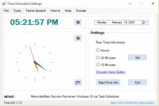 Keywords: Time Info, Speaking Time Info, Time information, auto time informer Speaking Time Information Application best features: Speaking out loud telling You about time. Easily customized to set notification time for 15 minutes, 30 minutes or hourly. The sound comes the computer default voice (which is different in among Windows OS) The voice pack can be added manually, even now Time Info App automatically speaks your own language, off course windows supported languages Convert text to speech (TTS) with audio saving functionality Create Alarm or Reminder which you can set to your own schedule The program is running perfectly for windows 10, but still works fine in the old windows 7.