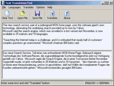 Keywords: translation, translator, translate, tts, text-to-speech, english translation, spanish translation, english to spanish, spanish to english, english to portuguese, german to english, french to english, italian to english, free translation, french translation, foreign Translation software Translation Pad is a simple internet machine language translation software. The software supports the following language pairs: english to german, english to spanish, english to french, english to portuguese, english to italian, german to english, french to english, spanish to english, portuguese to english, italian to english, german to french and french to german. You may open a file or cut and paste text into the top box, click Translate button and the translated text will be displayed in a separate window. Then it is possible to save the translated text as a text file. Translation Pad can even read the translated text using text-to-speech engine.