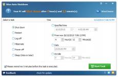 Company: WiseCleaner.com Country: Canada, B.C.,, Vancouver, ASP member: Yes Company Web site: https://www.wisecleaner.com Site of program: https://www.wisecleaner.com/ Application info: https://www.wisecleaner.com/wise-auto-shutdown.html Video: https://youtu.be/B_aoTIHUsaQ Author: Ivan Cooper Sales email: submit@wisecleaner.com Support email: submit@wisecleaner.com License type: Freeware Class: System Utilities::Automation Tools Specific: Categories: Launchers & Shutdown Tools, Automation Software, Shutdown Utilities, System Platform: Windows OS: Win2000, WinXP, Win7 x32, Win7 x64, Windows 8, Windows 10, WinServer, WinOther, WinVista, WinVista x64 System requirements: No Special Requirements Language: English, Albanian, Arabic, Azerbaijani, Bengali, Bulgarian, Byelorussian, Catalan, Chinese, ChineseSimplified, ChineseTraditional, Croatian, Czech, Danish, Dutch, Estonian, Finnish, French, Georgian, German, Greek, Hungarian, Indonesian, Italian, Japanese, Korean, Kurdish, Persian, Polish, Portuguese, Romanian, Russian, Serbian, Slovak, Slovenian, Spanish, Swedish, Thai, Turkish, Ukrainian, Vietnamese Limitations: None