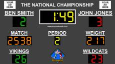 Keywords: wrestling, scoreboard, scoreboard download, computer scoreboard, software scoreboard, virtual scoreboard, scorekeeping, board, time, match, period, team, weight, advantage, clock Use the computer and display you already have with our wrestling scoreboard software to transform your pc into a virtual wrestling scoreboard. Our scoreboard download is great for scorekeeping wrestling games in gyms, arenas, or multipurpose facilities. Wrestling Scoreboard Standard features a simple to use mouse and keyboard interface, allowing for easy control of all functions of the computer scoreboard. Wrestling Scoreboard Standard is an inexpensive and portable alternative to costly physical scoreboards. Using our software scoreboards offers the flexibility to switch between different sports using the same hardware, which fixed scoreboards cannot match. Our Wrestling Scoreboard Standard software is shareware, so you can try our scoreboard download for FREE before purchasing. FEATURES: Easily accessible full screen mode. Optional secondary control screen. Click and type or tab and type interface for easy control. Fully customizable scoreboard colors High visibility LED digits Customizable team names Clean and simple design allows for easy reading by spectators Fits most monitors by adjusting to different display resolutions. Portable USB key allows you to quickly and easily move registration between computers. INCLUDES: Game clock Match scores Team scores Current period Match number Weight number KEY OPTION: Customizable keys make controlling the scoreboard quick and easy. SOUND OPTIONS: Change the buzzer and end of period sounds to use your own audio files COLOR OPTIONS: Easy to use options allow you to customize every color to match your team's colors. Optional discrete selection border around the active element of the scoreboard shows the part of the scoreboard you are controlling. OTHER OPTIONS: Customizable period durations let you set the length of each period. Customize the style of digits used to display numbers. Also allows you to change the scoreboard picture, which may be used for advertising space.