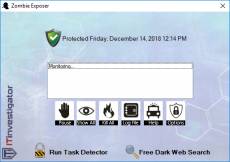 Company: ITinvestigator.com Country: United States of America, CA, Los Angeles ASP member: No Company Web site: https://www.itinvestigator.com Site of program: http://www.itinvestigator.com/ Application info: https://www.itinvestigator.com/zombie-exposer/ Author: Gerri Fonver Sales email: itinvestigator.pad@submitpad.org Support email: itinvestigator.pad@submitpad.org License type: Freeware Class: Security & Privacy::Anti-Virus Tools Specific: Categories: Internet :: Security, Security Tools :: Virus Scanners, Internet :: Online Privacy, Security Tools :: PC Access Control Platform: Windows OS: Win2000, WinXP, Win7 x32, Win7 x64, Windows 8, Windows 10, WinServer, WinOther, WinVista, WinVista x64 System requirements: Supports all versions of Windows Language: English Limitations: None