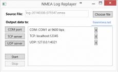 Keywords: GPS, GLONASS, NMEA, protocol, replay, playback NMEA Log Replayer is free application usable for testing all kinds of NMEA applications (GPS, GLONASS, instrumentation, etc). Can playback pre-recorded GPS files with NMEA output. It can send NMEA to multiple destinations at the same time. For example, you can send NMEA sentences to remote host and write the same NMEA log to COM port on your computer. It can output NMEA to: Network host over UDP, Network host over TCP,COM Port (RS232). How to use it Actually, it is easy as 1, 2, 3: 1) Click 'Choose file' and select NMEA log file for playback; 2) Select output destinations by clicking 'COM port', 'TCP server' or 'UDP server'; 3) Click 'Start'. If you are going to send NMEA to remote host, please make sure, that something is waiting for connection on that remote host (in case of TCP. In case of UDP you can launch remote software at any time, since UDP protocol is connectionless). If some error happens on some output then you will see exclamation mark near 'X' button.
